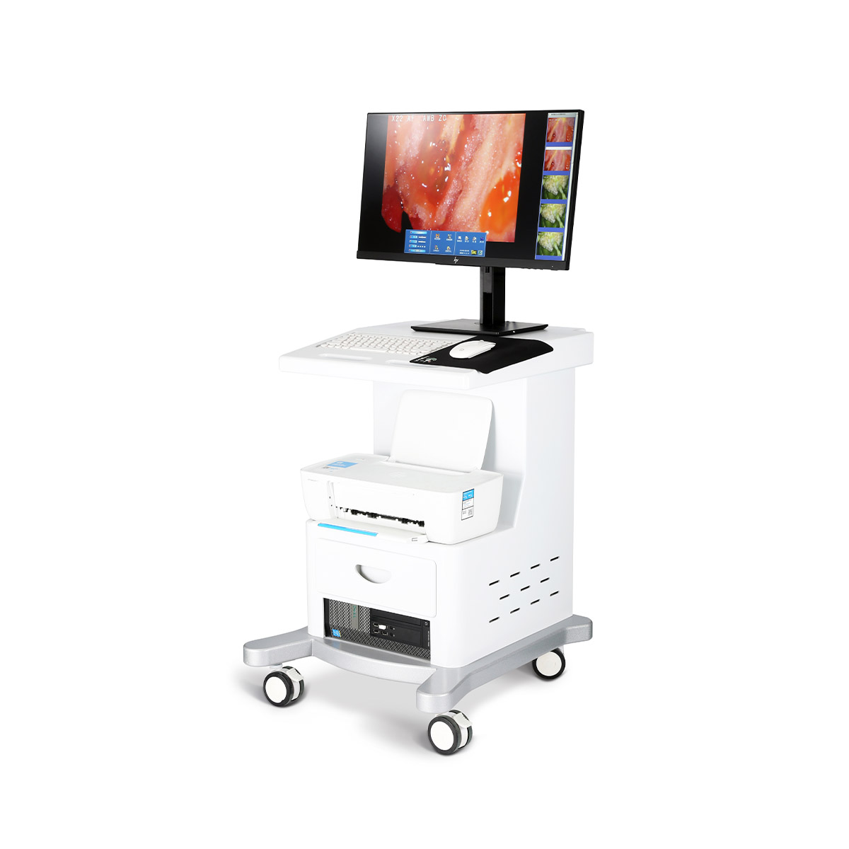 內(nèi)置多圈環(huán)形高亮LED白色光源機(jī)構(gòu);搭配三級(jí)濾光功能、醋酸反應(yīng)計(jì)時(shí)功能、品牌電腦配置、直立式支架可自由升降實(shí)時(shí)動(dòng)態(tài)的圖像處理功能:放大、縮小圖像、凍結(jié)、采集、錄像回放、自動(dòng)聚焦、存儲(chǔ)、再現(xiàn)、圖像處理、多光源切換等。